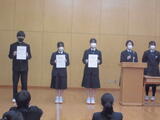 今日から3学期がスタートし、生徒たちの元気な姿が学校に戻ってきました。始業式では代表生徒が「新リーダー」や「受験生」などそれぞれの立場での抱負や決意を述べました。前を向き発表する姿が素晴らしかったです。「あけましておめでとうございます、今年もよろしくお願いします」と新年の挨拶で始まった校長講話。内容はおみくじのルーツから「目標をもってチャレンジする1年に」でした。