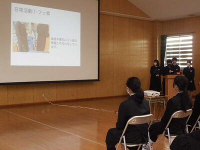 今日は生徒会事務局主催の新入生歓迎会が行われました。第1部では事務局や専門委員長から活動についてスライドを使いながらわかりやすく説明がありました。また、交流活動「人間知恵の輪」では、全校を縦割り班に分けて行いました。課題をクリアすると、喜びの歓声とともに笑顔が溢れていました。