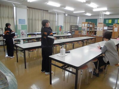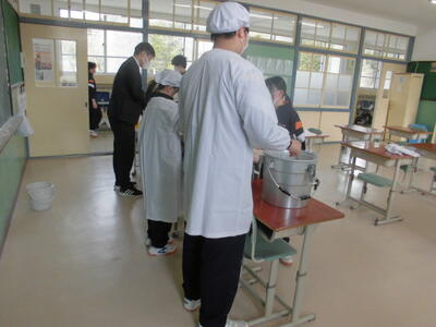 今日のメニューは入学お祝いメニュー(ポークカレー&クレープ)でした。給食準備は当番が台拭きを調理室から持ってきて、配膳台を拭くことから始めます。今日は2年生が自分の学年の物だけでなく、他学年の台拭きまで持ってきてくれました。それに対して他の学年の生徒が「ありがとう」と声をかけていました。おいしい給食と「ありがとう」で幸せな時間となりました。